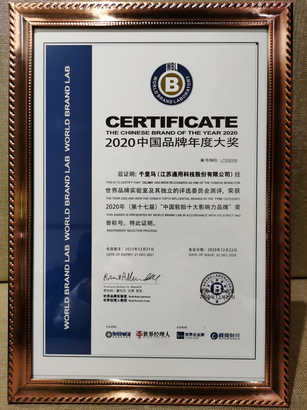 12月22日,由世界品牌實驗室主辦的2020中國品牌年度大獎評選在北京隆重舉行,會上正式揭曉中國輪胎品牌榜。千里馬輪胎憑借強大的品牌