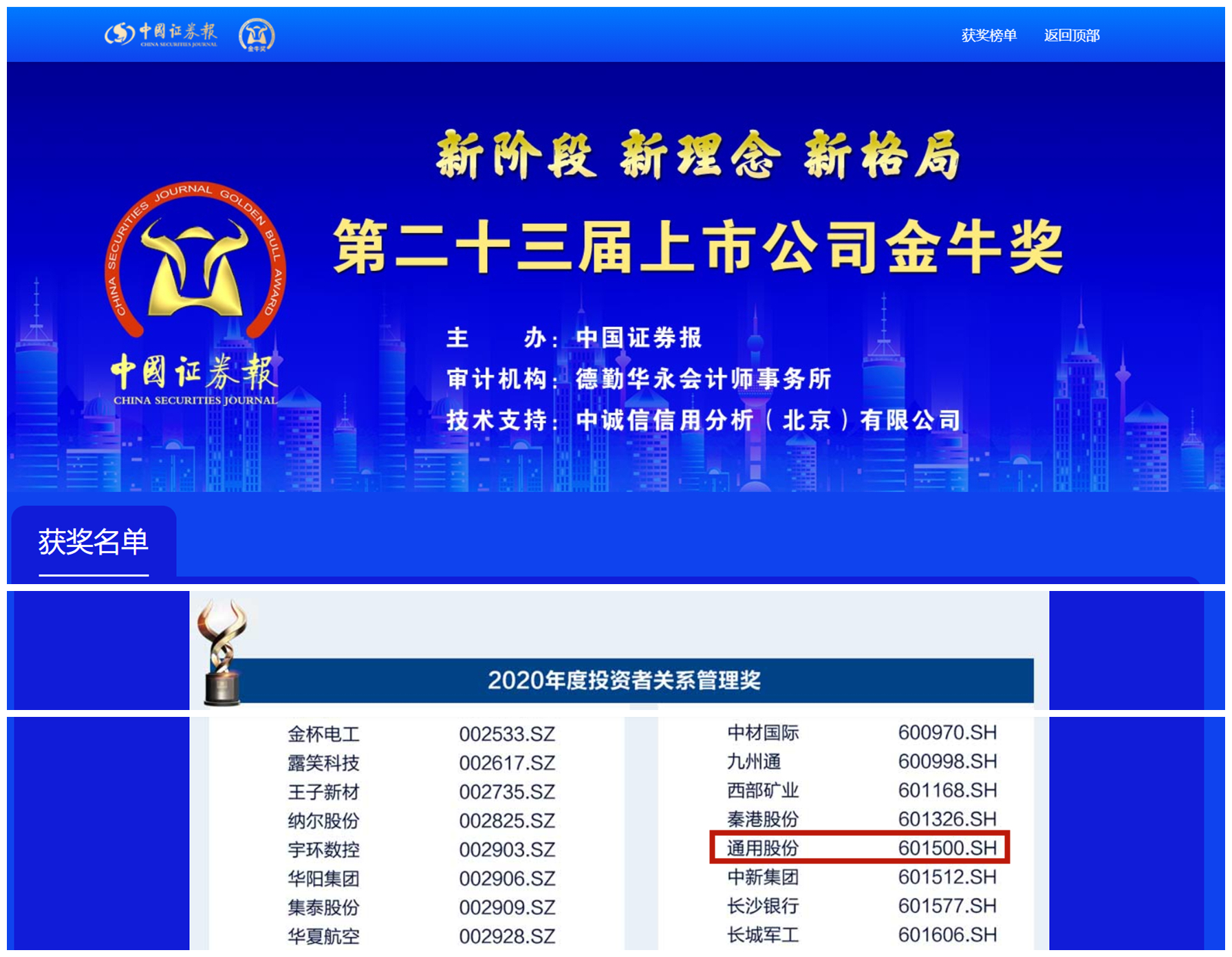 據(jù)了解,金牛獎(jiǎng)是中國(guó)證券報(bào)鼎力打造的金融品牌,旨在公開(kāi)、公正、公平原則下,表彰上一年度業(yè)績(jī)優(yōu)秀、治理卓越、具有崇高使命和社會(huì)責(zé)任感的上市公司。自1999年創(chuàng)立以來(lái),金牛獎(jiǎng)評(píng)選已至第二十三屆,是中國(guó)資本市場(chǎng)最具影響力的獎(jiǎng)項(xiàng),在中國(guó)資本市場(chǎng)中具有上市公司“奧斯卡”的美譽(yù)。