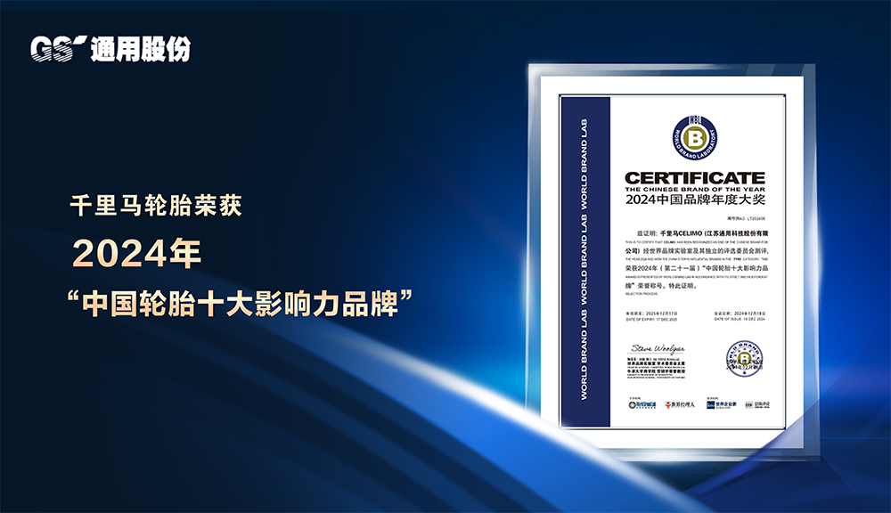 12月18日,通用股份旗下千里馬輪胎連續六年榮獲“中國輪胎十大影響力品牌”稱號。這項殊榮來自2024年第二十一屆“中國品牌年度大獎”評選,該獎項由世界品牌實驗室頒發,旨在表彰在中國市場具有突出影響力的品牌。
