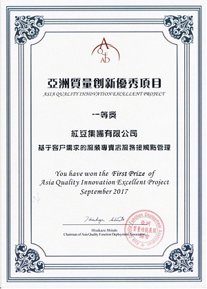 9月26日-27日,第二屆亞洲質(zhì)量功能展開與創(chuàng)新研討會在杭州舉行,紅豆集團發(fā)表的“基于客戶需求的連鎖專賣店服務(wù)接觸點管理”項目,榮獲亞洲質(zhì)量創(chuàng)新優(yōu)秀項目一等獎。國家質(zhì)檢總局質(zhì)量管理司副司長陳曉波,亞洲QFD協(xié)會會長、國際著名質(zhì)量專家、日本戴明獎評審委員長新藤久等國內(nèi)外知名專家學(xué)者擔任本次研討會嘉賓,現(xiàn)場共有200余家企業(yè)參加本次研討會。紅豆等30余家企業(yè)進入研討會現(xiàn)場發(fā)表環(huán)節(jié),經(jīng)專家評審和企業(yè)答辯,紅豆集團等10家企業(yè)發(fā)表的項目得到評審組高度認可,榮獲一等獎。